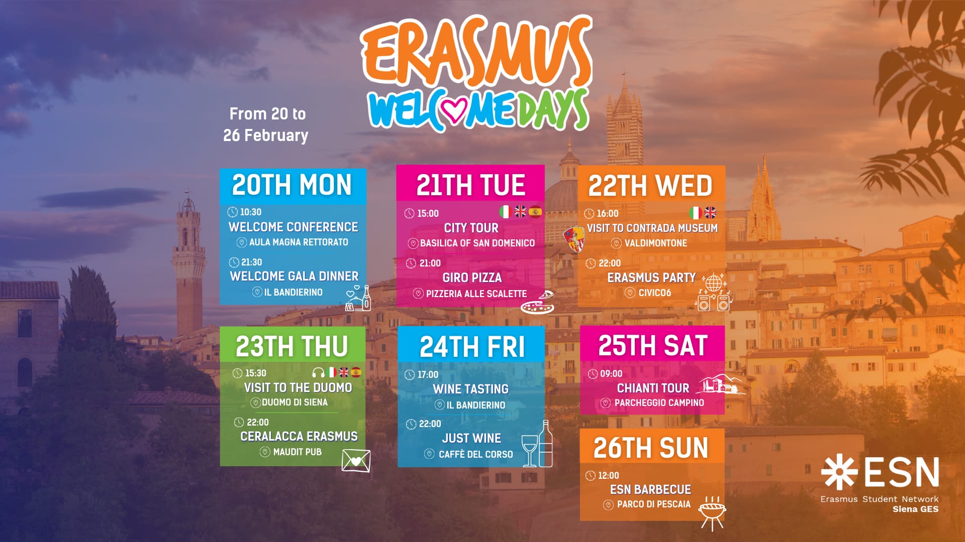 Lunedì iniza la Welcome Week e noi dello Staff di ESN Siena GES abbiamo pensato ad una serie di eventi che non dimenticherete facilmente e che vi faranno innamorare di questa bellissima città!!